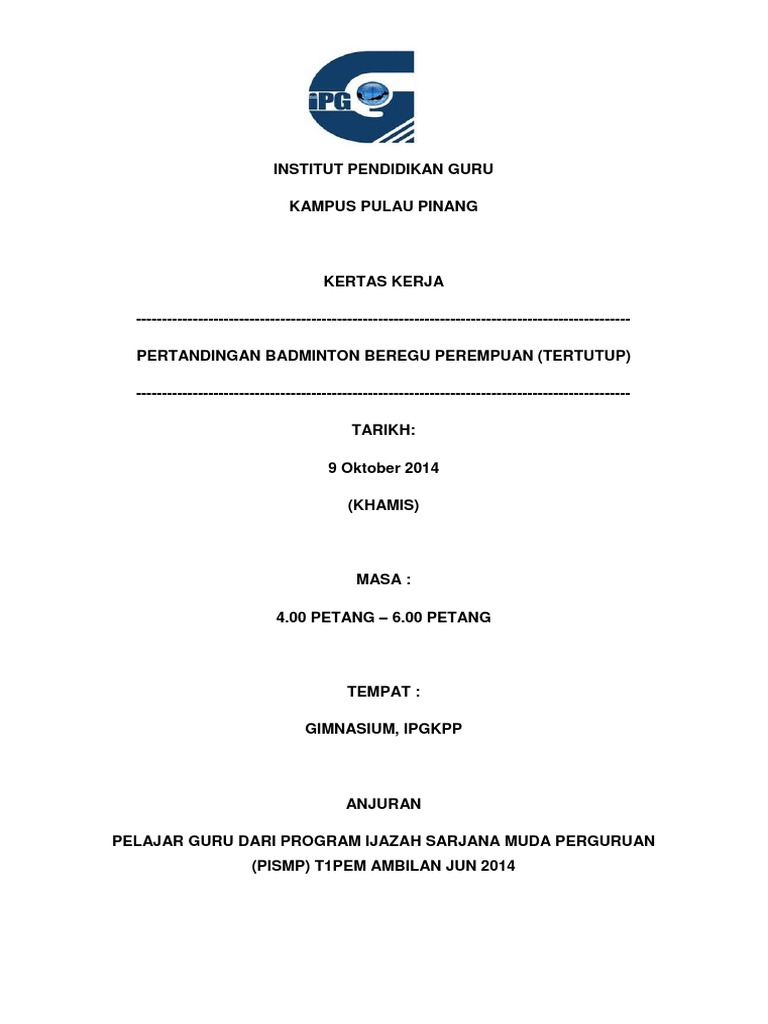 Di samping itu pertandingan ini juga bertujuan melahirkan atlet sukan badminton IPGM. INSTITUT PENDIDIKAN GURU KAMPUS RAJA MELEWAR 70990 SEREMBAN NEGERI SEMBILAN KERTAS KERJA KEJOHANAN BADMINTON TERTUTUP PROGRAM PENSISWAZAHAN GURUPPG PENDIDIKAN JASMANI DAN KESIHATAN AMBILAN FEB 2012 Tarikh. Laporan tentang Pertandingan Badminton.